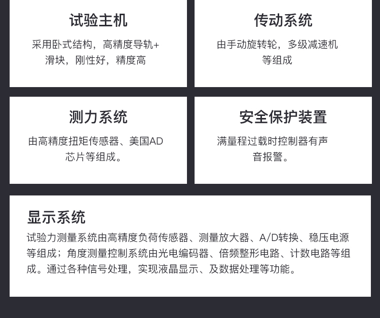 五、系統(tǒng)配置 1.主機一臺; 2.高精密導軌+滑塊二副; 3.減速系統(tǒng)一套 4.高精度負荷傳感器一只; 5.噴塑外殼一套 6.電源線、數(shù)據(jù)線各一根 7.地腳螺栓一套 8.試驗工具一套 9.扭轉(zhuǎn)附具一套 10.說明書、合格證、裝箱單各一份 11.全數(shù)字MCU控制系統(tǒng)一套;