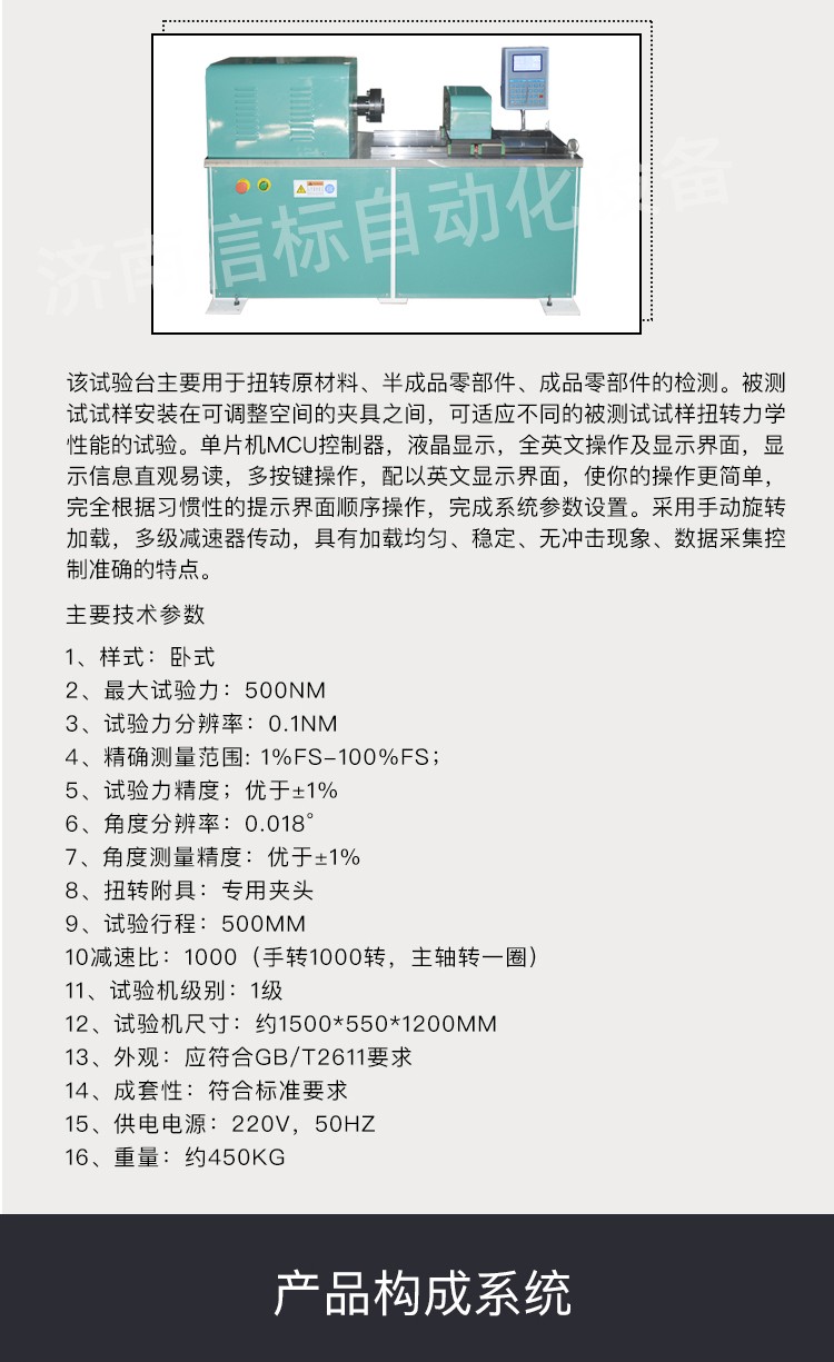 1、可以實現(xiàn)合格性試驗:判定扭矩扭角間的對應關(guān)系,觀察試驗是否變形、或是破壞 2、可以實現(xiàn)破壞性試驗:扭斷試驗,扭至試樣斷裂,求取峰值 三、產(chǎn)品構(gòu)成系統(tǒng): 1 試驗主機:采用臥式結(jié)構(gòu),高精度導軌+滑塊,剛性好,精度高。 2 傳動系統(tǒng):由手動旋轉(zhuǎn)輪,多級減速機等組成。 3 測力系統(tǒng):由高精度扭矩傳感器、美國AD芯片等組成。 4 顯示系統(tǒng):試驗力測量系統(tǒng)由高精度負荷傳感器、測量放大器、A/D轉(zhuǎn)換、穩(wěn)壓電源等組成;角度測量控制系統(tǒng)由光電編碼器、倍頻整形電路、計數(shù)電路等組成。通過各種信號處理,實現(xiàn)液晶顯示、及數(shù)據(jù)處理等功能。 5 安全保護裝置:滿量程過載時控制器有聲音報警。