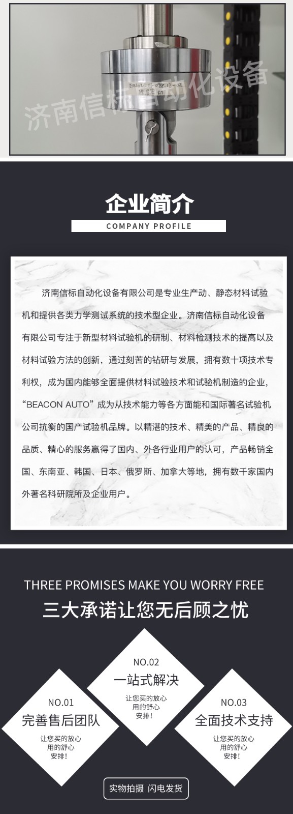 濟南信標自動化設(shè)備有限公司主要生產(chǎn):動靜態(tài)萬能疲勞試驗機,接骨板彎曲試驗機,縫合線拉伸疲勞試驗機,髖膝關(guān)節(jié)磨損試驗機,電子萬能試驗機、液壓萬能試驗機、巖石三軸、四軸,電液拉力試驗機,材料試驗機,高低溫蠕變,高低頻疲勞,拉伸、扭轉(zhuǎn)、杯突等二十多個系列兩千多個的品種。