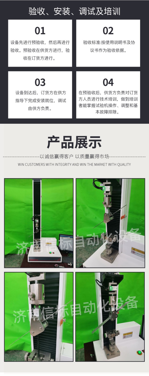 高強度膠黏劑膠帶浮棍法90度180度剝離強度試驗機主要功能及特點: 1、主機: 1.1調速系統采用伺服電機和自主研發減速系統,性能穩定可靠,具有過流、過壓、過載等保護裝置。調速范圍可達0.05~500mm/min。 1.2傳動部分采用圓弧同步齒形帶,精密絲杠副傳動,傳動平穩,噪音低,傳動效率高。 1.3萬向節采用十字插銷結構,而且具有擺角限制功能,一方面便于試樣夾持,保證試驗同心度,另一方面很好的消除了不規則試樣對傳感器的影響。 2、控制系統、操作軟件及數據處理系統 2.1計算機控制系統,具有集成度高、性能穩定、調整方便等優點。可以對實驗數據進行實時采集,對實驗特性曲線實現實時動態顯示,試驗數據文件能以Access常用數據庫或SQLserve大型數據庫的方式保存,方便實現客戶的資源共享及網絡管理,以及用戶的再分析。對于用戶自定義的各種word2000報表,該軟件可輕松實現訪問,解決了不同用戶或同一用戶在不同時期對試驗報表有不同需要的難題。該軟件可處理試驗力、位移、時間、變形的原始數據及由此派生的曲線。