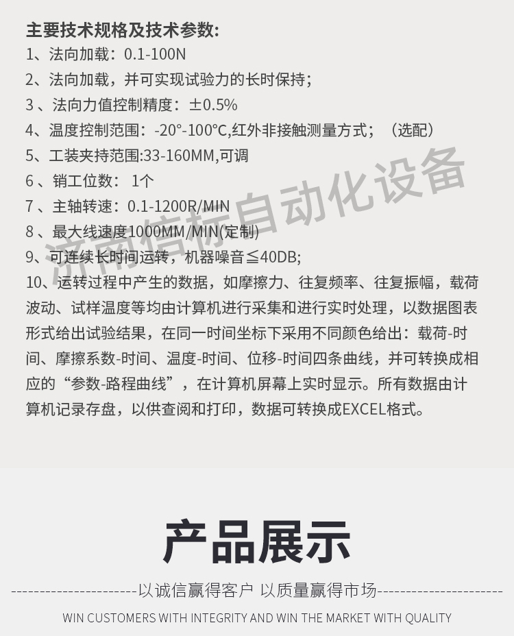 2.10運轉過程中產生的數據,如摩擦力、往復頻率、往復振幅,載荷波動、試樣溫度等均由計算機進行采集和進行實時處理,以數據圖表形式給出試驗結果,在同一時間坐標下采用不同顏色給出:載荷-時間、摩擦系數-時間、溫度-時間、位移-時間四條曲線,并可轉換成相應的“參數-路程曲線”,在計算機屏幕上實時顯示。所有數據由計算機記錄存盤,以供查閱和打印,數據可轉換成Excel格式。1.主要技術要求及滿足情況:(水平運動總成選配)