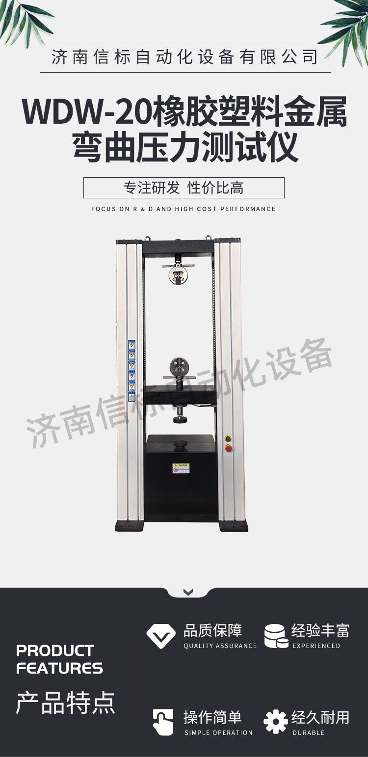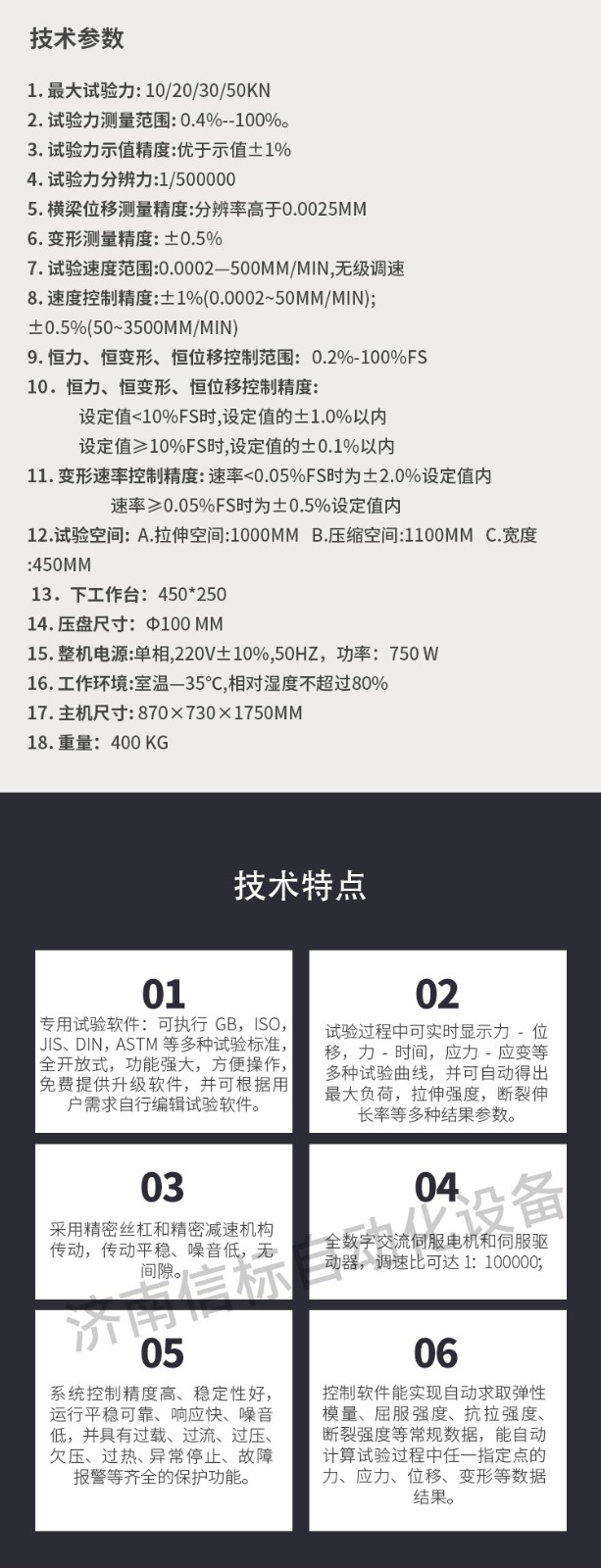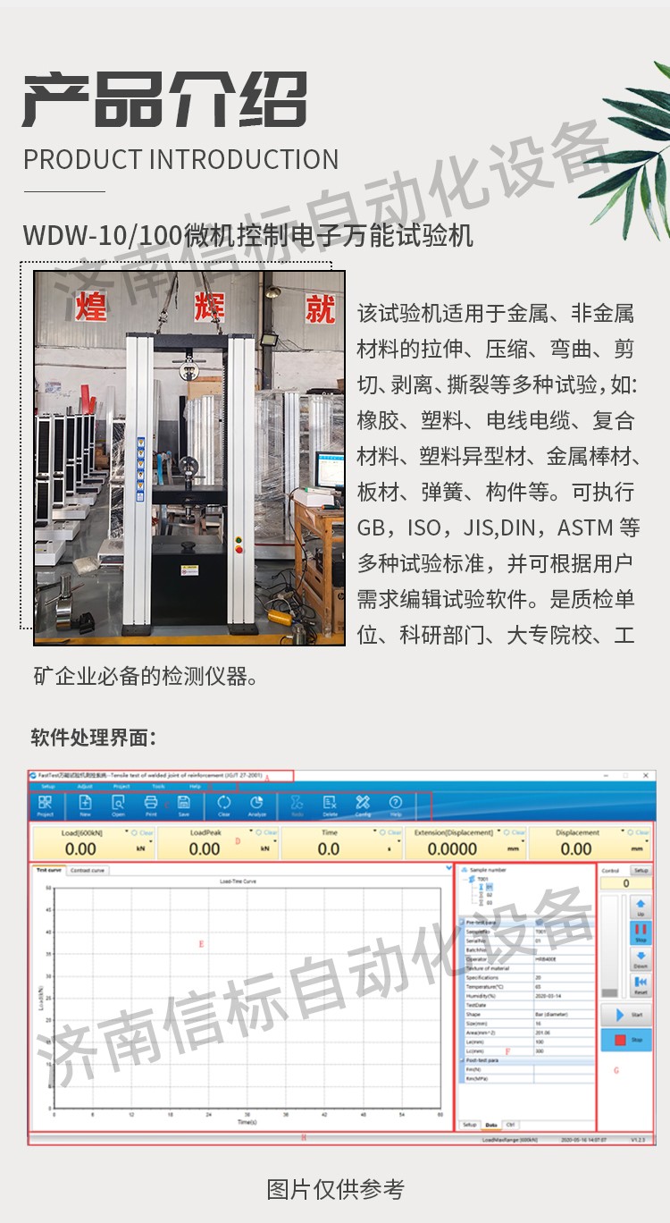 該試驗機適用于金屬、非金屬材料的拉伸、壓縮、彎曲、剪切、剝離、撕裂等多種試驗,如:橡膠、塑料、電線電纜、復合材料、塑料異型材、金屬棒材、板材、彈簧、構件等??蓤?zhí)行GB,ISO,JIS,DIN,ASTM等多種試驗標準,并可根據(jù)用戶需求編輯試驗軟件。是質(zhì)檢單位、科研部門、大專院校、工礦企業(yè)必備的檢測儀器。 二、測量參數(shù): 1. 最大試驗力: 10/20/30/50kN 2. 試驗力測量范圍: 0.4%--100%。 3. 試驗力示值精度:優(yōu)于示值±1% 4. 試驗力分辨力:1/500000 5. 橫梁位移測量精度:分辨率高于0.0025mm 6. 變形測量精度: ±0.5% 7. 試驗速度范圍:0.0002—500mm/min,無級調(diào)速 8. 速度控制精度:±1%(0.0002~50mm/min); ±0.5%(50~3500mm/min) 9. 恒力、恒變形、恒位移控制范圍: 0.2%-100%FS 10.恒力、恒變形、恒位移控制精度: 設定值<10%FS時,設定值的±1.0%以內(nèi) 設定值≥10%FS時,設定值的±0.1%以內(nèi) 11. 變形速率控制精度: 速率<0.05%FS時為±2.0%設定值內(nèi) 速率≥0.05%FS時為±0.5%設定值內(nèi) 12.試驗空間: A.拉伸空間:1000mm B.壓縮空間:1100mm C.寬度:450mm 13.下工作臺:450*250 14. 壓盤尺寸:φ100 mm 15. 整機電源:單相,220V±10%,50Hz,功率:750 W 16. 工作環(huán)境:室溫—35℃,相對濕度不超過80% 17. 主機尺寸: 870×730×1750mm 18. 重量:400 kg 三、產(chǎn)品配置: 1、主機 一套 2、松下A7全數(shù)字伺服電機及伺服驅(qū)動器; 一套 3、高精度負荷傳感器; 5kn/1kn/500N/200/ 各一支 4、Hiwin精密滾珠絲杠; 2支 5、光電編碼器(2500線,內(nèi)置); 1支 6、夾具:滿足海綿/汽車座椅所需工裝 1套(有多種)